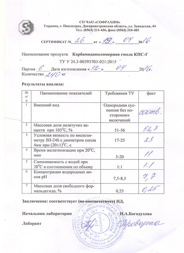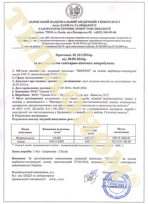 Кроме того, предприятие ТЕПЛОНОМ® постоянно контролирует качество єкоизола на экологичность. Проводятся выборки готового материала и проверка его на пары вредных веществ (формальдегид и аммиак). Результаты в виде протокола испытаний представлены ниже.