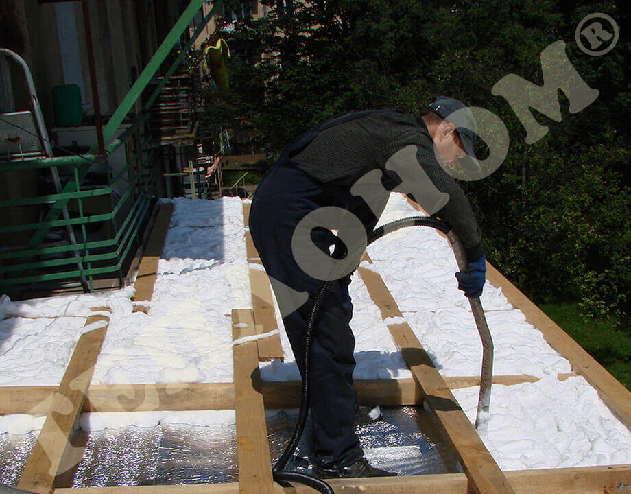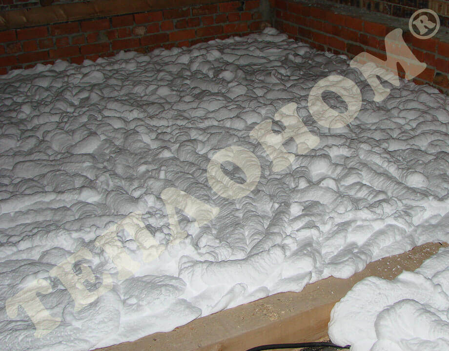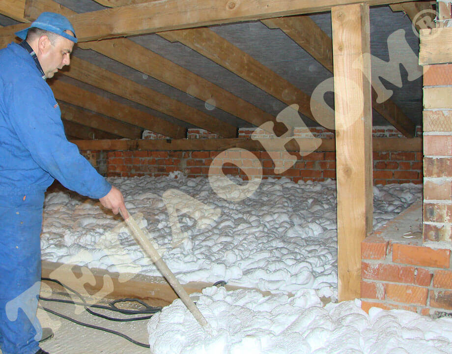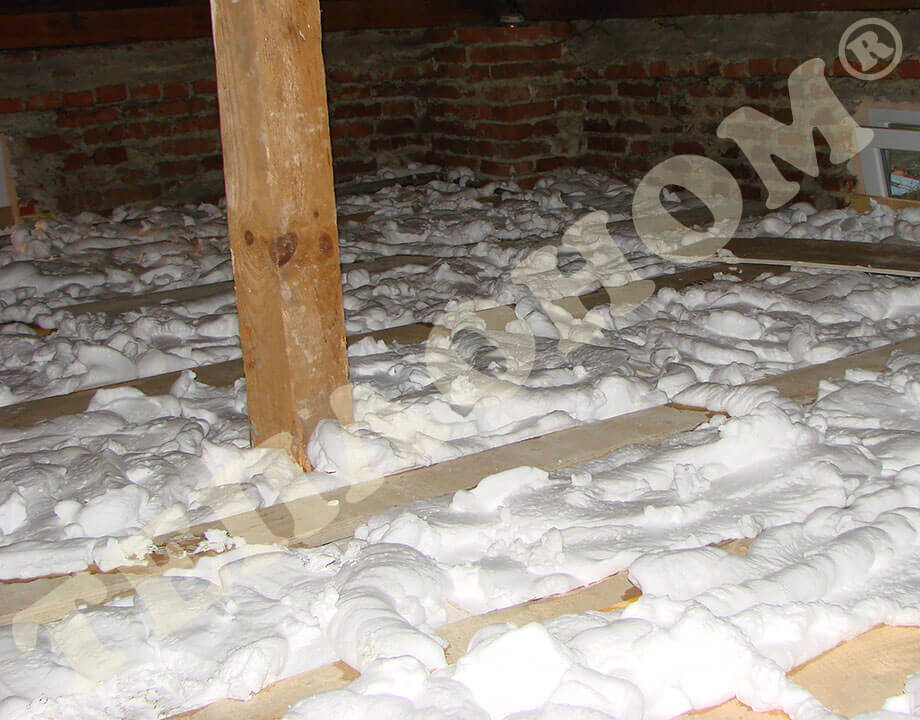 На фотографиях изображено утепление предприятием ТЕПЛОНОМ® чердака многоэтажных домов заливным пенопластом экоизол. При выполнении данных работ сначала на бетонное перекрытие настилается пленка паробарьер, после чего наносится слой утеплителя экоизол. По заливному пенопласту экоизол ходить нельзя, поскольку он не является конструктивным материалом. Если планируется использовать чердак, то необходимо обустроить деревянный пол с лагами.