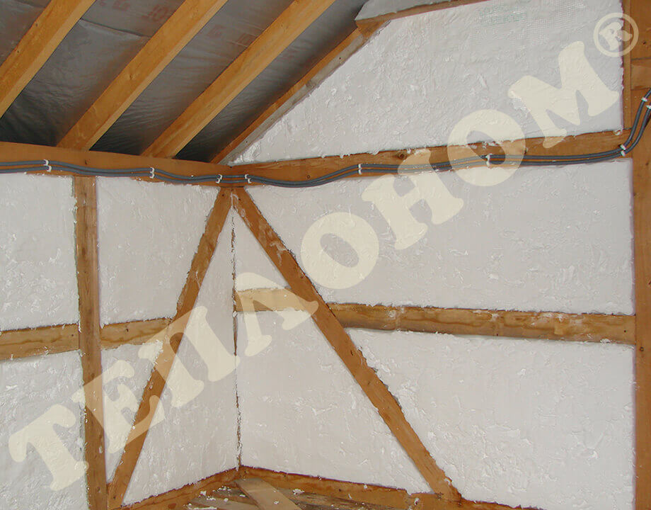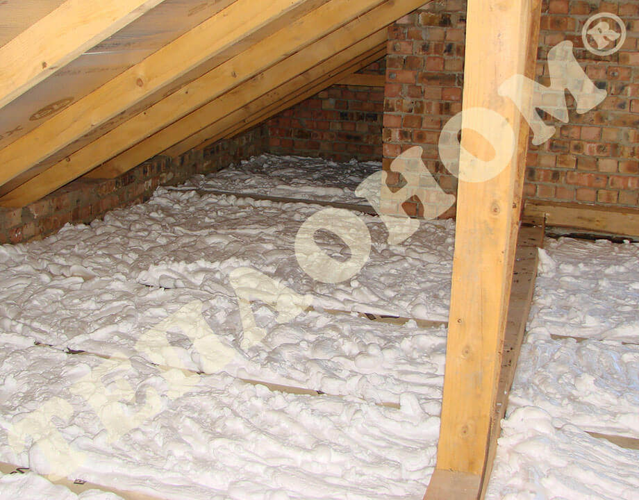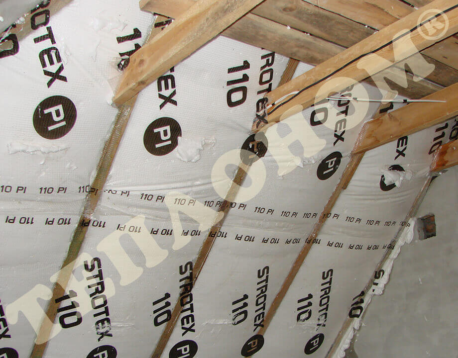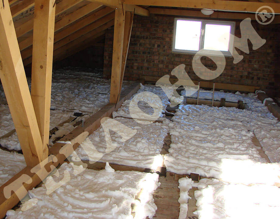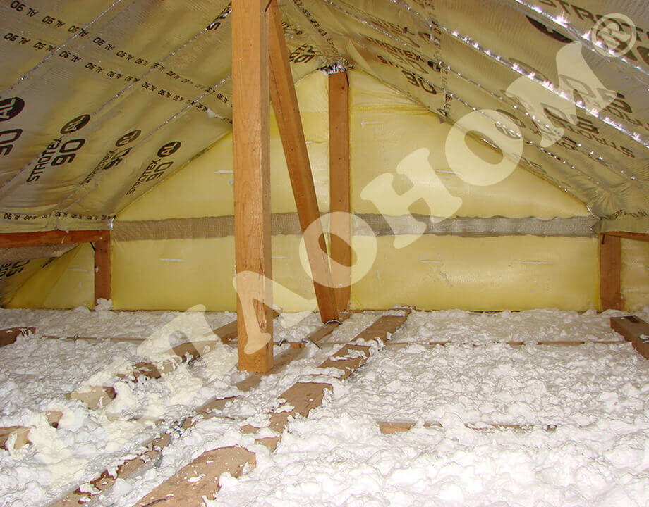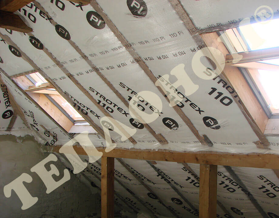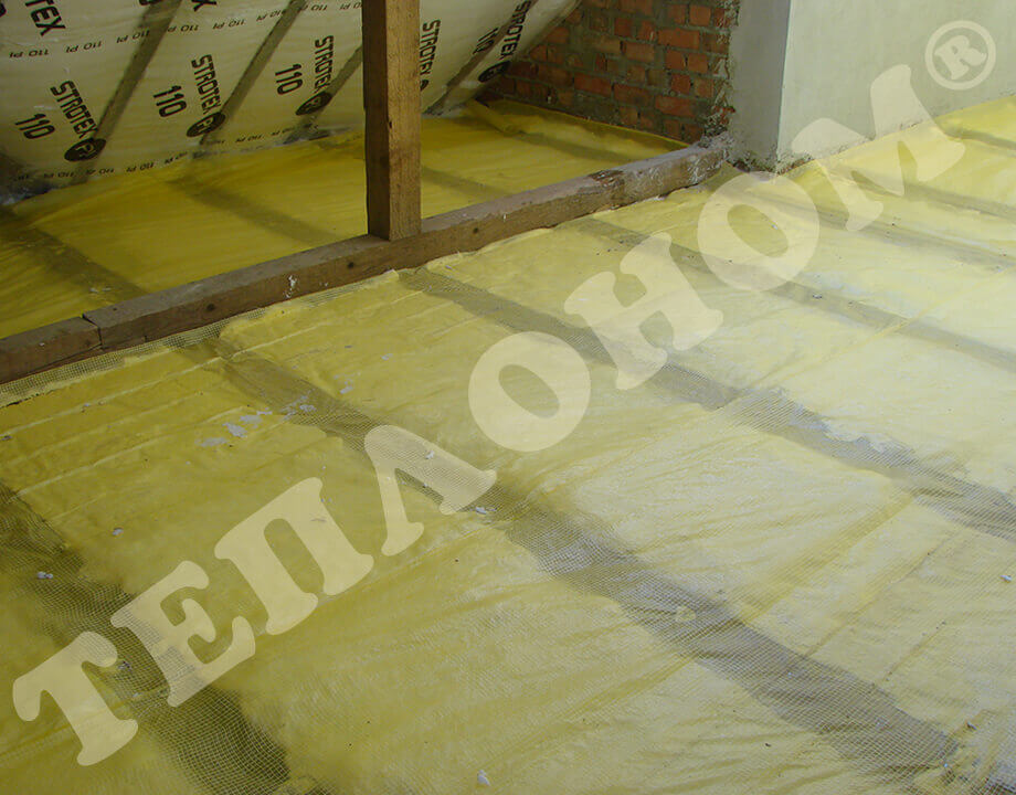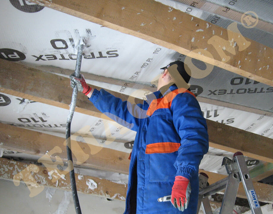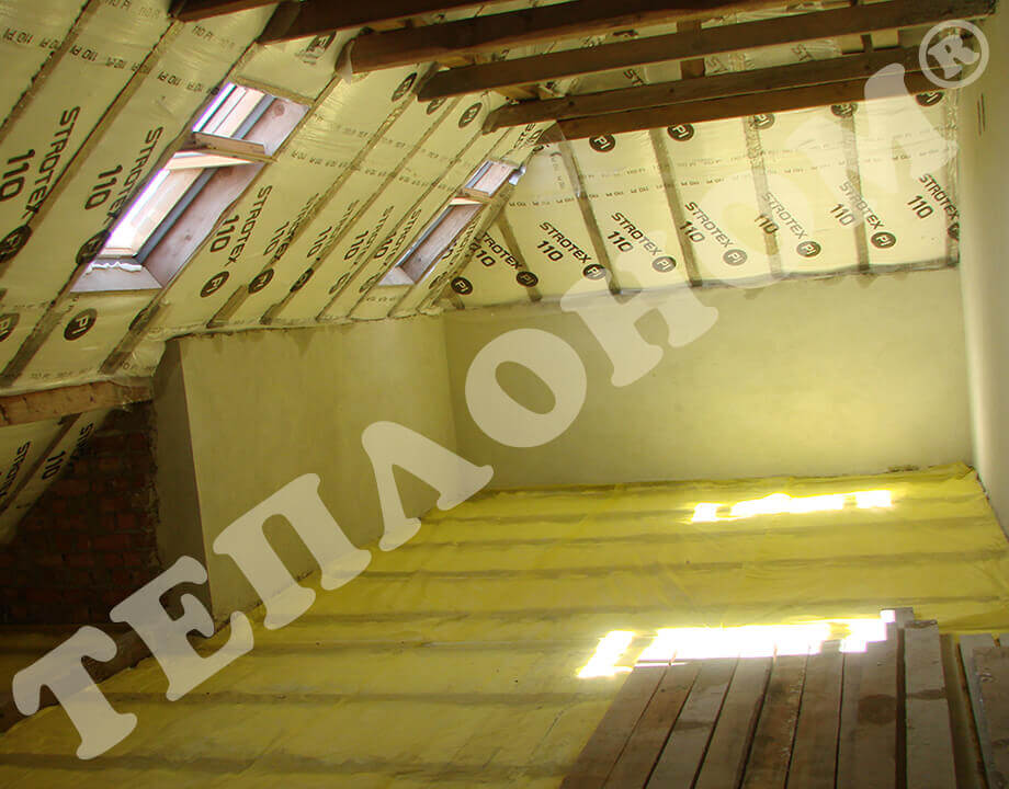 На фотографиях показано утепления предприятием ТЕПЛОНОМ® мансарды (крыши) между стропилами заливным пенопластом экоизол. утепление выполняется за армированную пленку паробарьер. В данном случае это: strotex 110 PI или strotex 90 AL (фольгированный). Утепление выполняется под давлением, что позволяет заполнить все щели и уменьшает технологическую усадку материала.