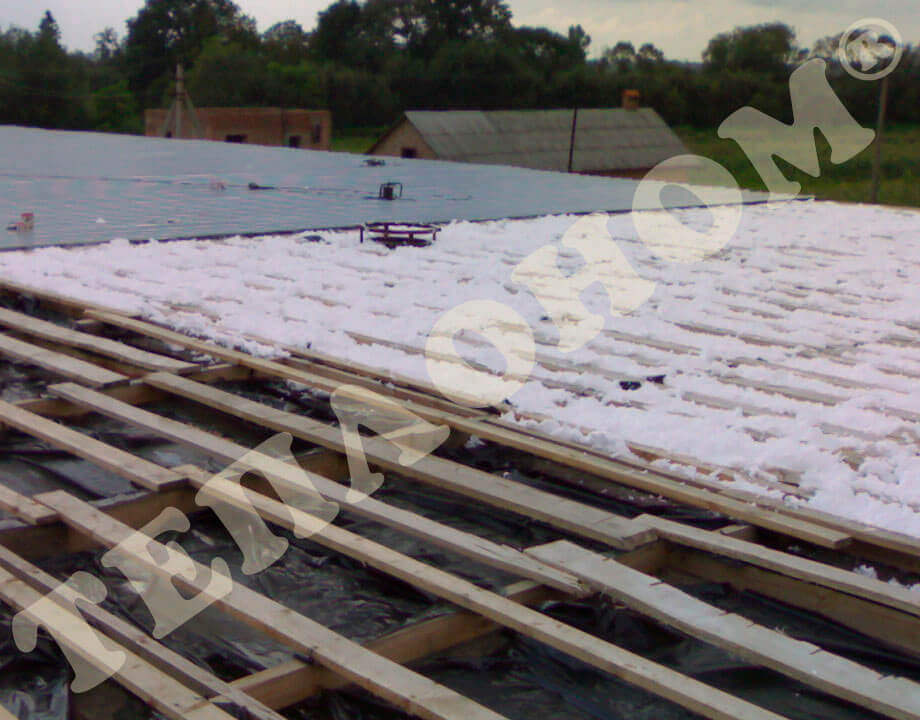 На фотографиях изображено утепление крыши между стропилами заливным пенопластом экоизол. Утепление выполняется поочередно: сначала расстилается пленка паробарьер, затем монтируются стропила, дальше идет утепление заливным пенопластом экоизол между стропилами. После этого слой экоизола накрывается супердиффузионной мембраной или пленкой гидробарьер. Далее монтируется именно перекрытия: профнастил, черепица и т. Данный вид утепления позволяет значительно уменьшить потери тепла зимой и сохраняет прохладу летом.