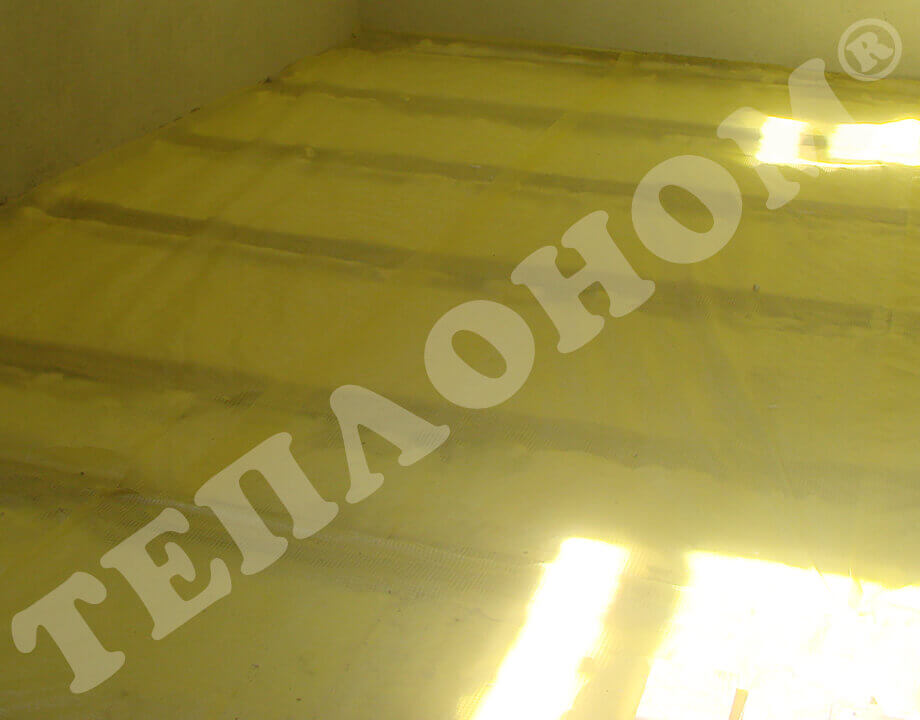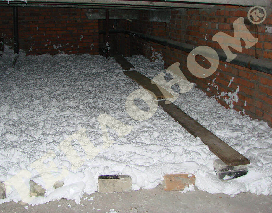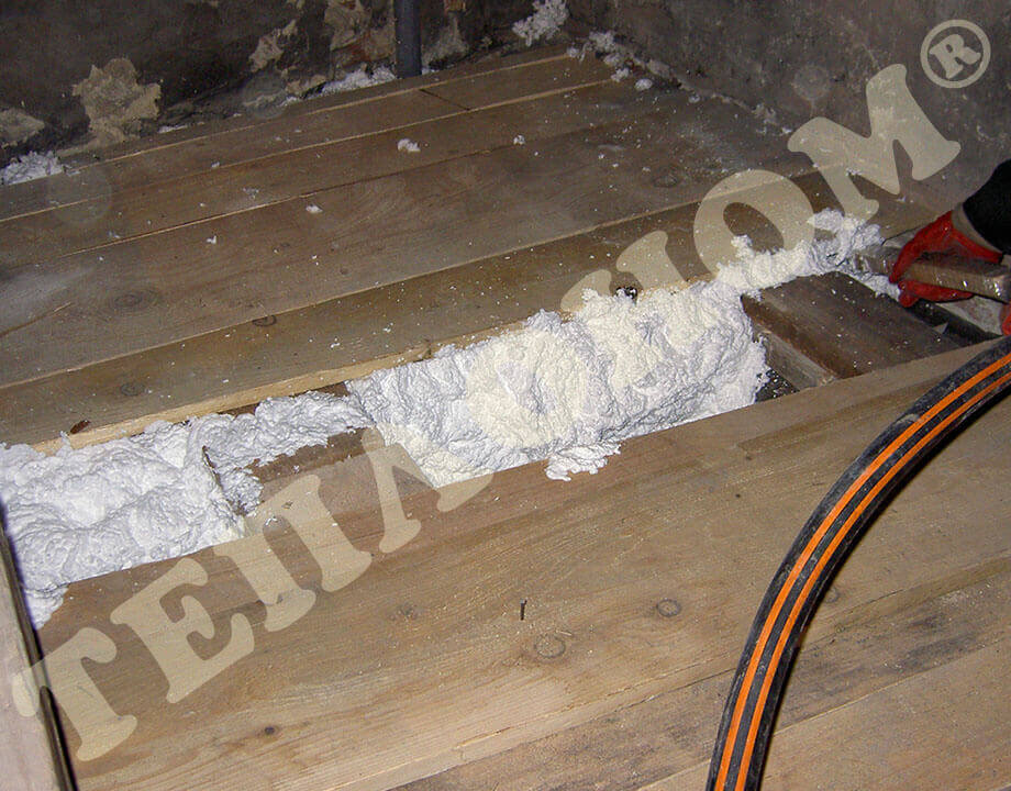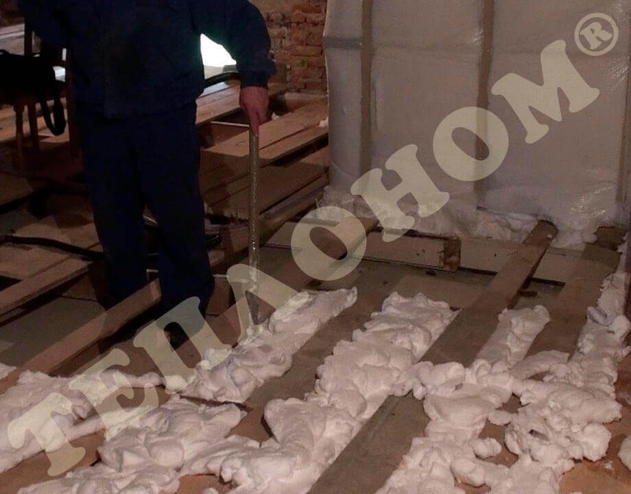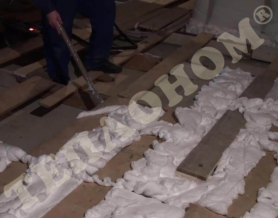 На фотографиях показано утепление предприятием ТЕПЛОНОМ® пола (потолка) между лагами заливным пенопластом экоизол. Утепление выполняется между лагами при частично демонтированных досках пола. Также такое утепление может выполняться через отверстия диаметром 16мм под избыточным давлением без демонтажа пола.