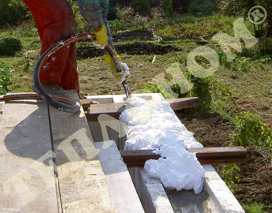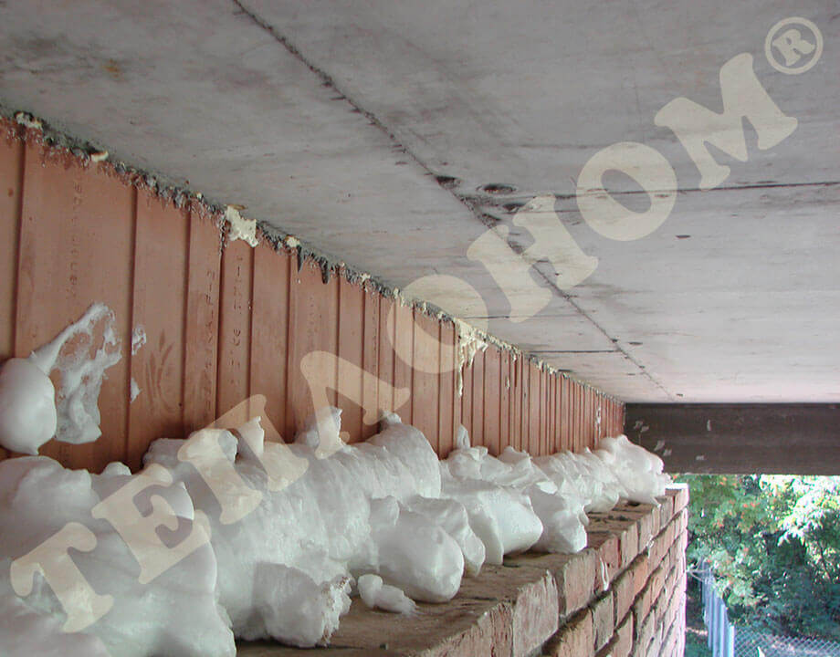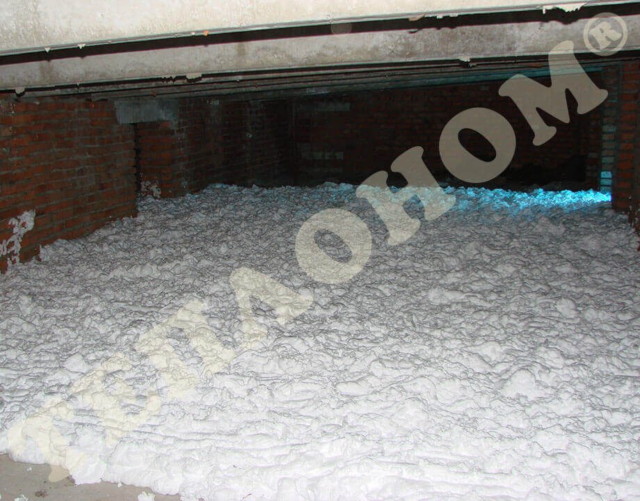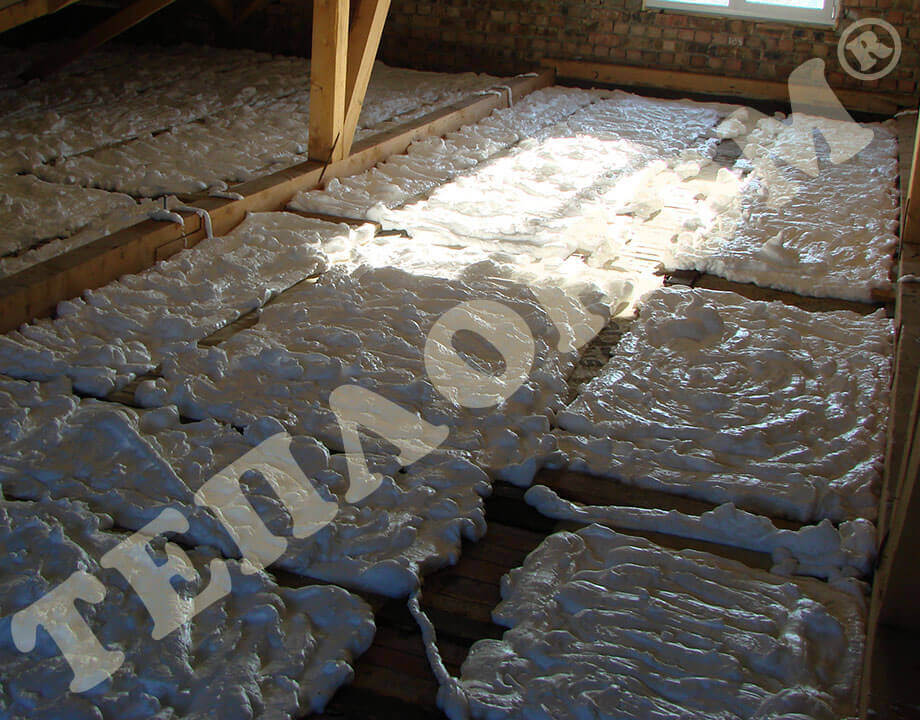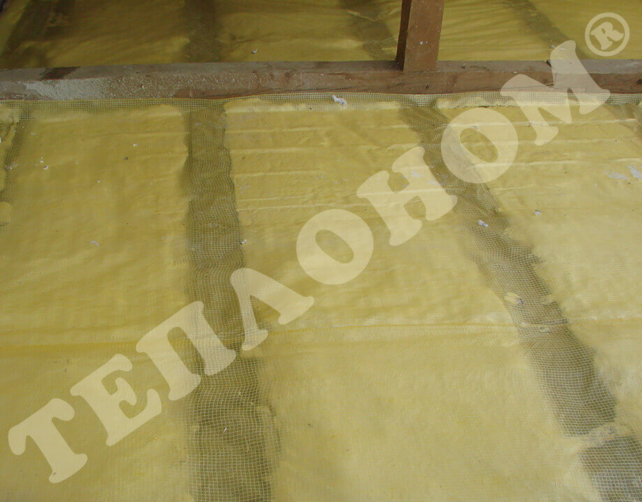 На фотографиях показано утепление предприятием ТЕПЛОНОМ® пола (потолка) между лагами заливным пенопластом экоизол. Утепление выполняется между лагами при частично демонтированных досках пола. Также такое утепление может выполняться через отверстия диаметром 16мм под избыточным давлением без демонтажа пола.