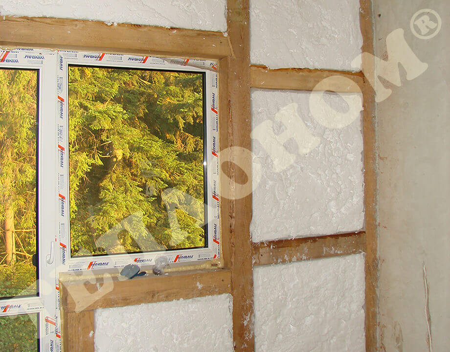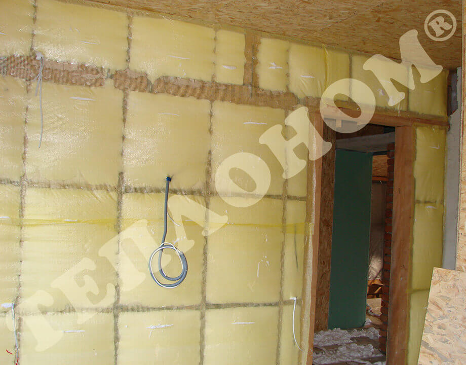 На фотографиях можно увидеть утепление предприятием ТЕПЛОНОМ® каркасного дома заливным пенопластом экоизол. Утепление производится с внутренней стороны дома. Сначала стены обшиваются армированной пленкой паробарьер, затем проводится утепление заливным пенопластом экоизол. После трех дней полимеризации пленка снимается, экоизол выравнивается с помощью ножа. Далее необходимо высушить экоизол в течение 2-3 недель. Затем утеплитель зашивается пленкой паробарьер и плитой OSB.