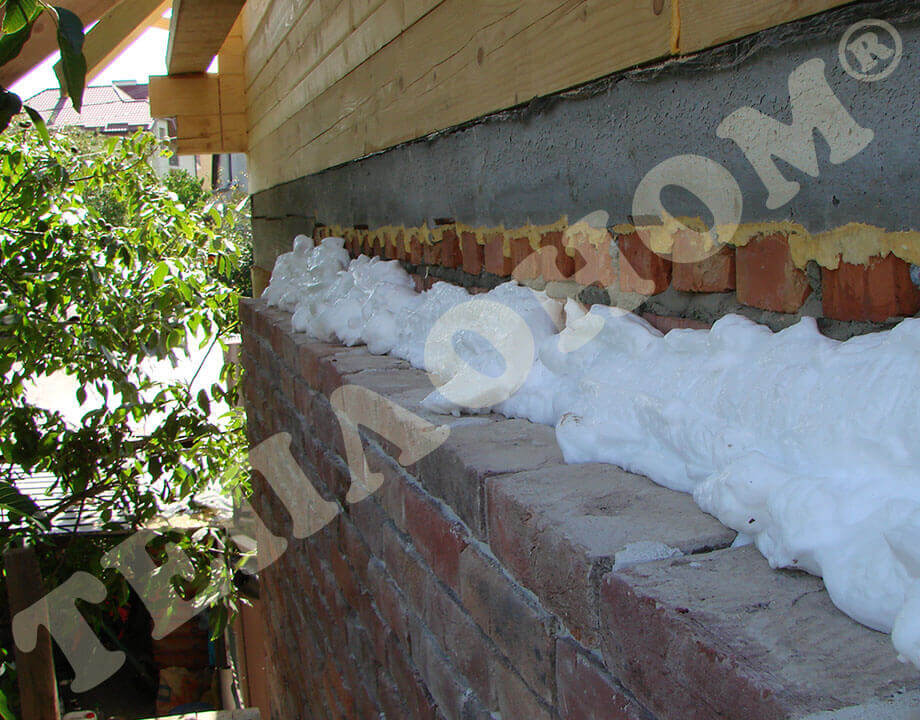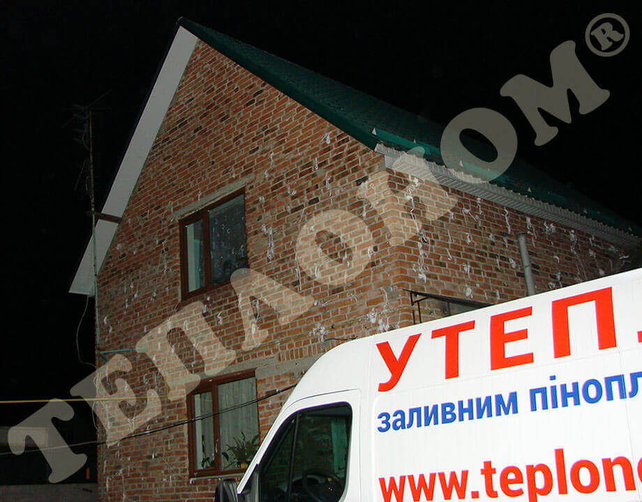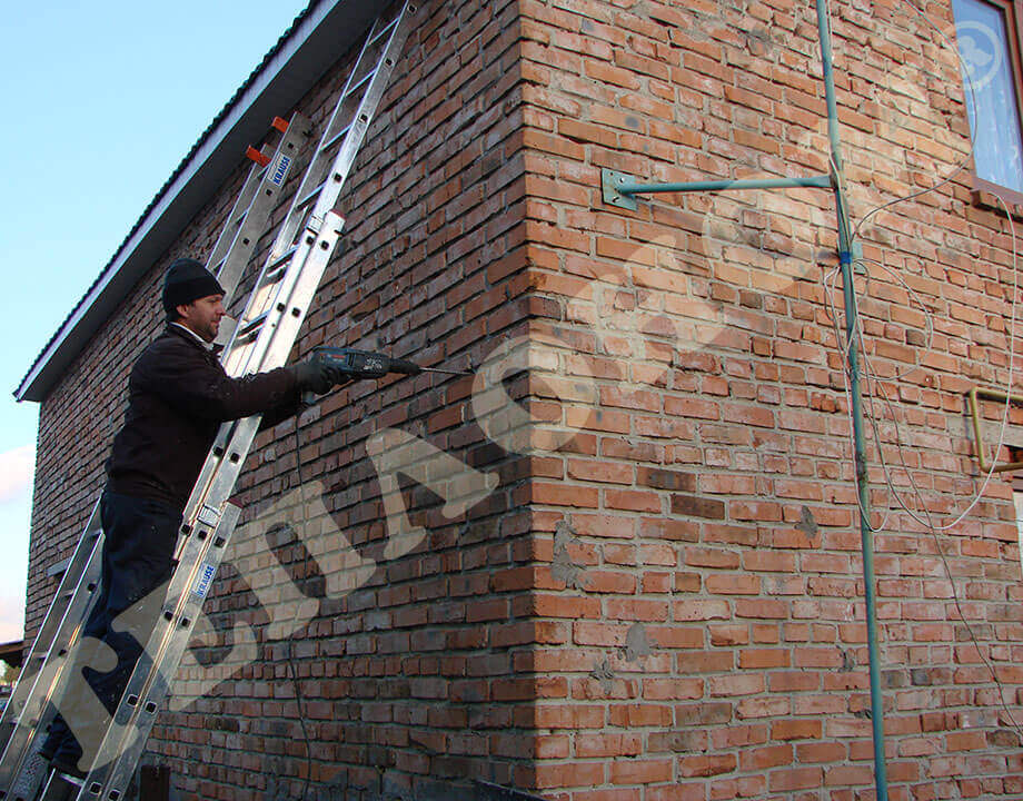 На фотографиях изображено утепление предприятием ТЕПЛОНОМ® стеновых пустот под давлением заливным пенопластом экоизол. Для этого сначала в стенах сверлятся отверстия диаметром 16мм в шахматном порядке на расстоянии 80 - 120 см друг от друга, затем проводится сам процесс утепление путем закачки пенопласта экоизол в пустоты. Закачка проводится при избыточном давлении 3 - 5 бар, что позволяет заполнить все пустоты и щели в стенах. Данный вид утепления существенно экономит тепло в доме.