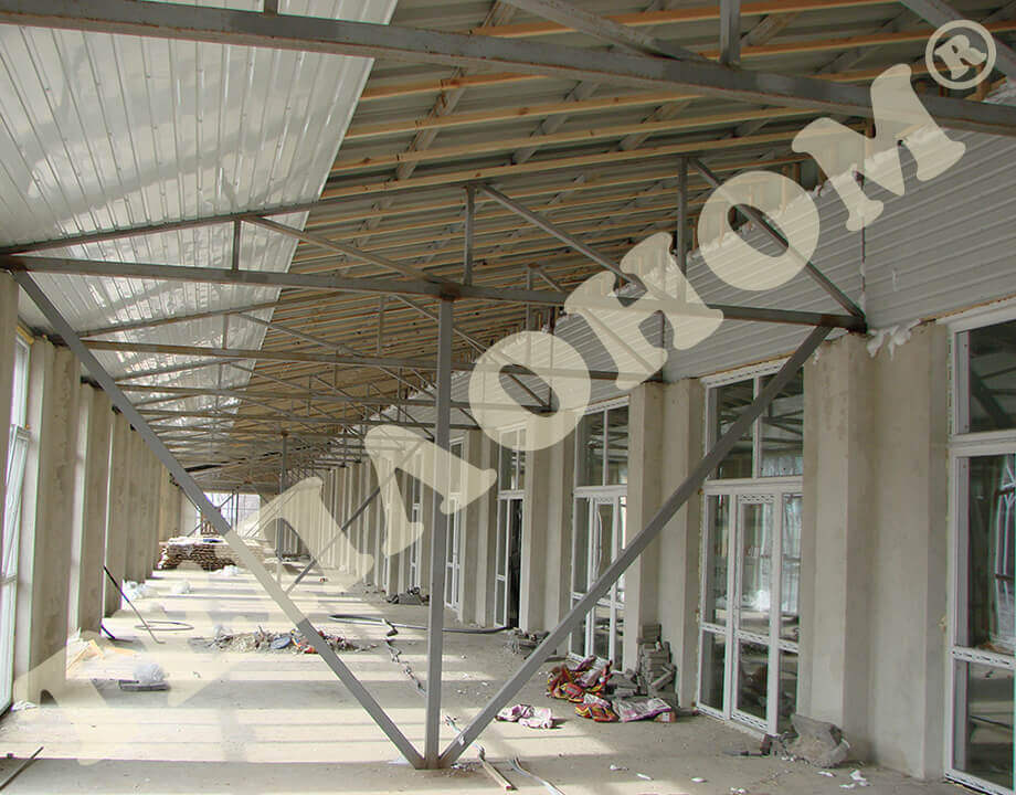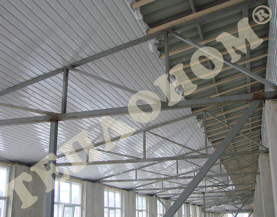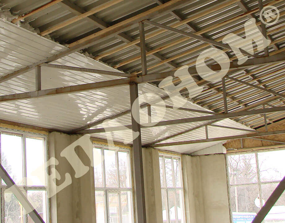 На фотографиях показано утепления предприятием ТЕПЛОНОМ® крыши и стен торговых павильонов (киосков, базаров) заливным пенопластом экоизол. Утепление выполняется между двумя металлическими листами профнастила. При утеплении образуется сэндвич панель.